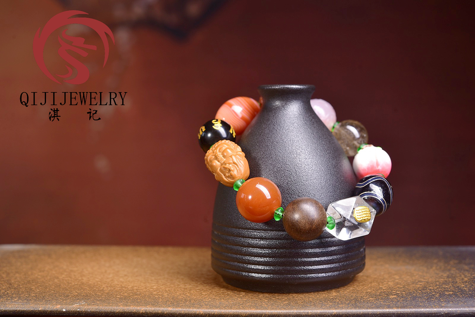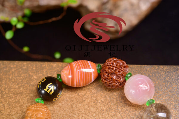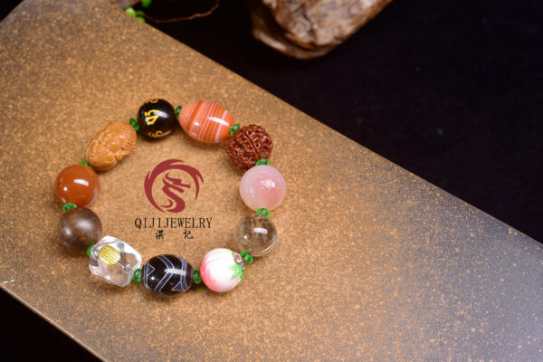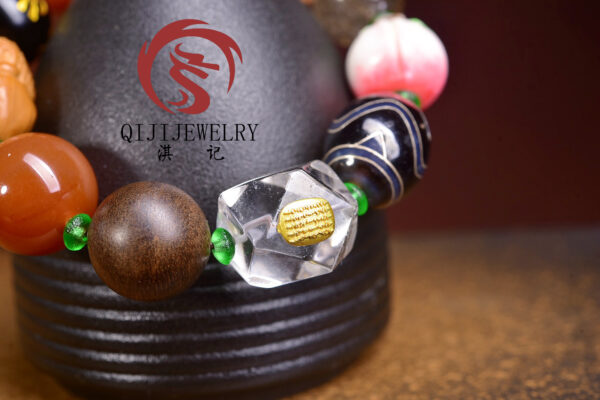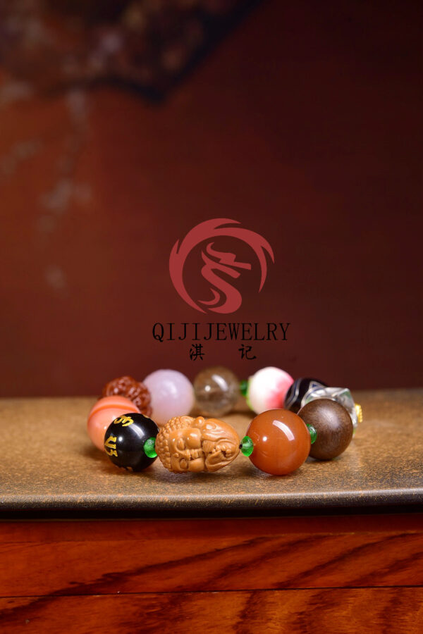 Original and imposing! Exquisite Duoduobao (a type of multi-gemstone) bracelet for literary playthings enthusiasts. It is made of red agate, baby Buddha olive nuts, obsidian beads with the Six Syllable Mantra, twisted silk agate, bodhi seed beads, crimson agate beads with a geometric pattern, natural rutilated quartz, hand-painted root carvings with a lucky peach design, tiger’s eye dzi beads inlaid with silver wire, irregularly shaped white quartz beads with the Five Buddhist Scriptures, agarwood beads from Brunei, and glass spacer beads. Each bead is carefully selected.