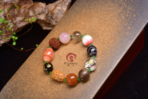 This is an exclusive design with vibrant colors. The multi-gemstone bracelet is believed to attract wealth and harmonize the five elements. It is a must-have item for every literary playthings enthusiast. The energy of literary playthings and jewelry is integrated into one, creating a powerful magnetic field. The size is approximately 18-19 millimeters, and it weighs around 83 grams.
