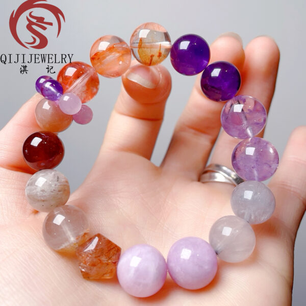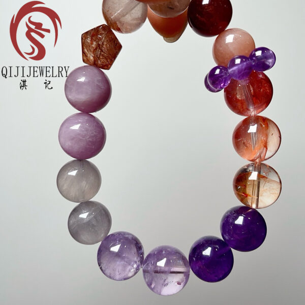The Five Elements preference is for fire! Natural red hematoid quartz, approximately 12.8 millimeters in size, is paired with Uruguayan amethyst, Bolivian amethyst, blue rabbit fur fluorite, kunzite, black and gold super seven, tiered phantom quartz, and sunstone.